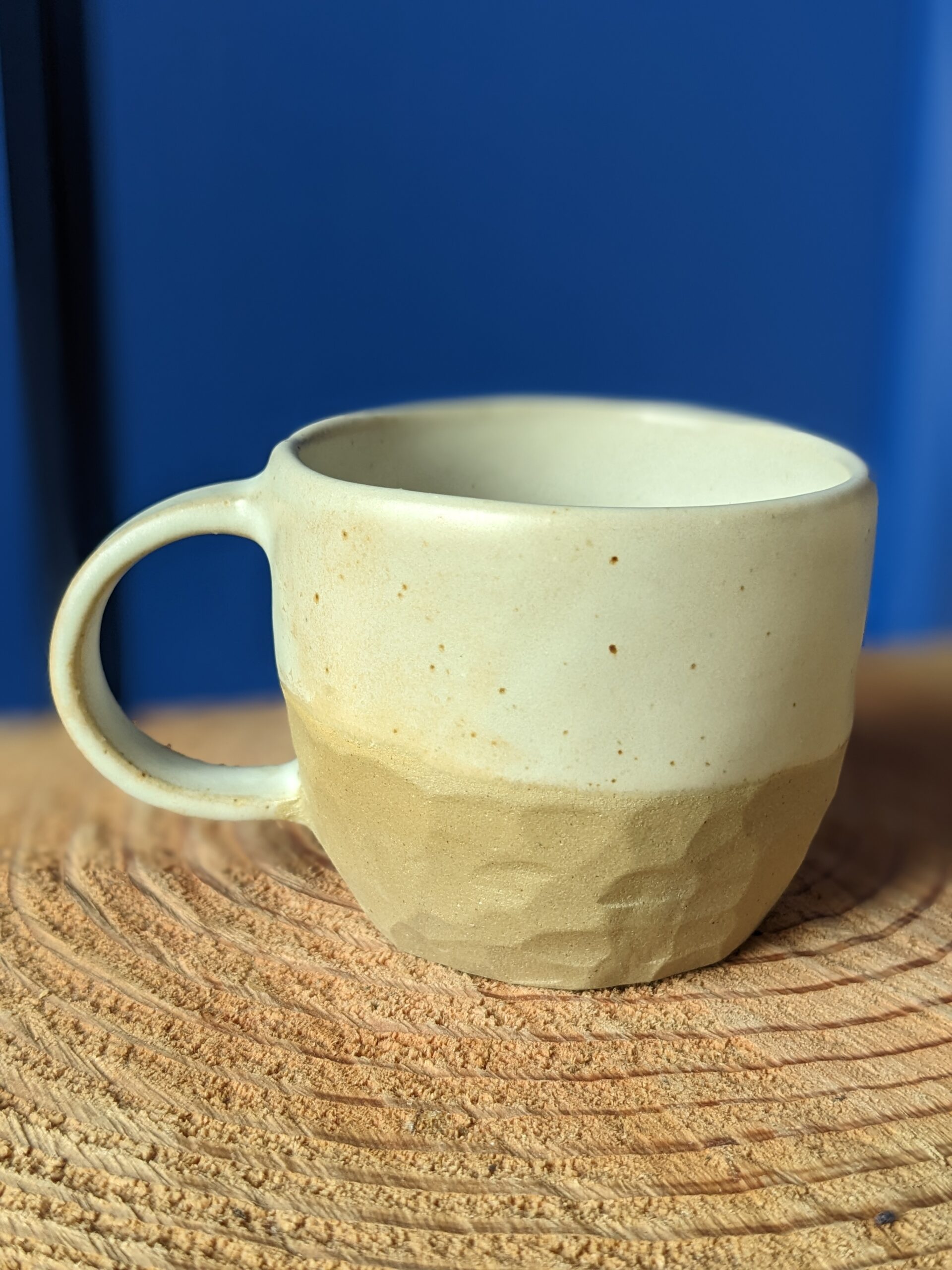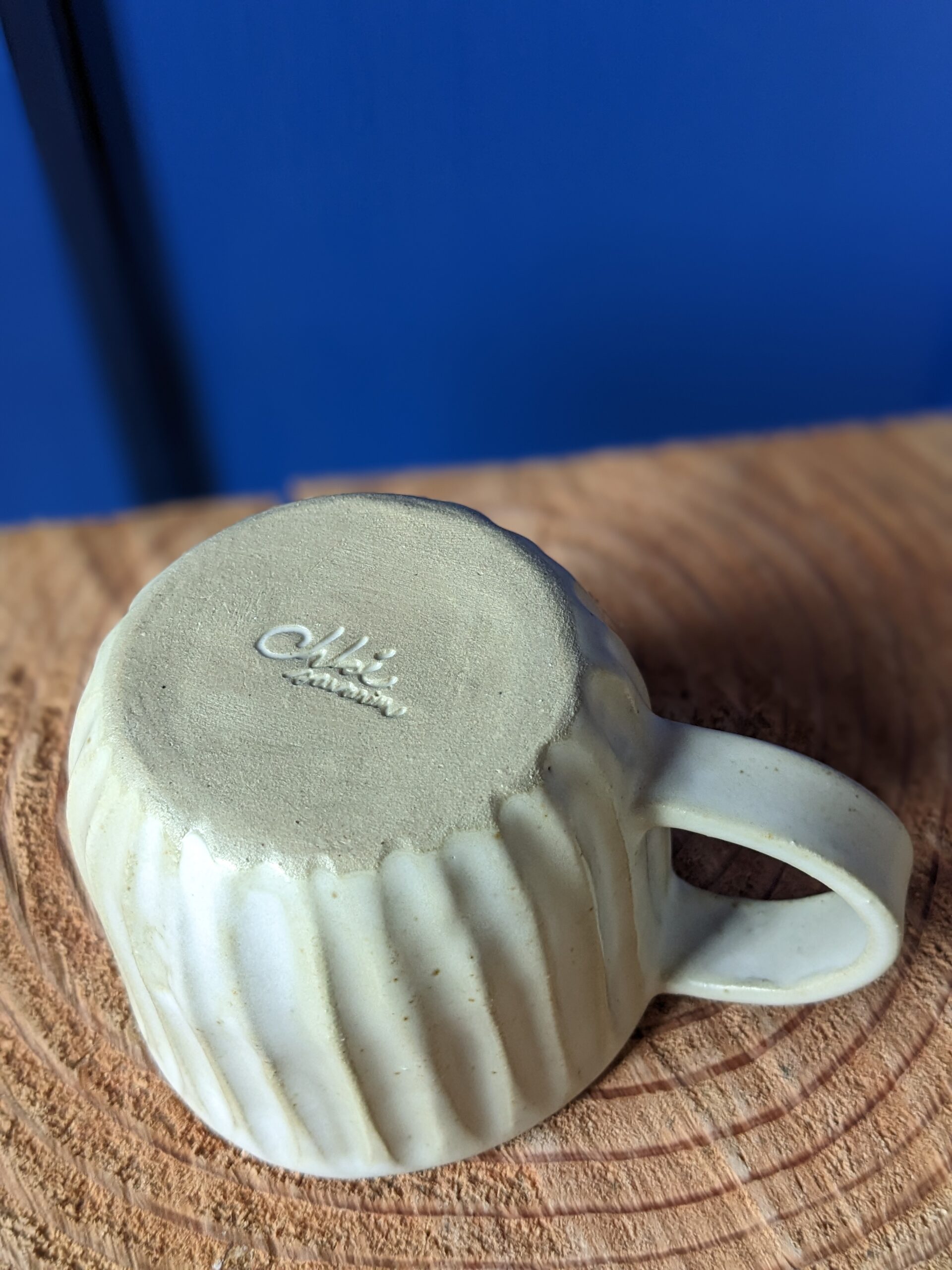 Modelé et décoré entièrement à la main dans mon atelier, ce mug en grès offre un format idéal pour savourer votre café, votre thé ou un bon matcha. Sa forme douce et sa finition texturée mettent en valeur un émail blanc mat, appliqué pièce par pièce, ce qui rend chaque exemplaire unique.