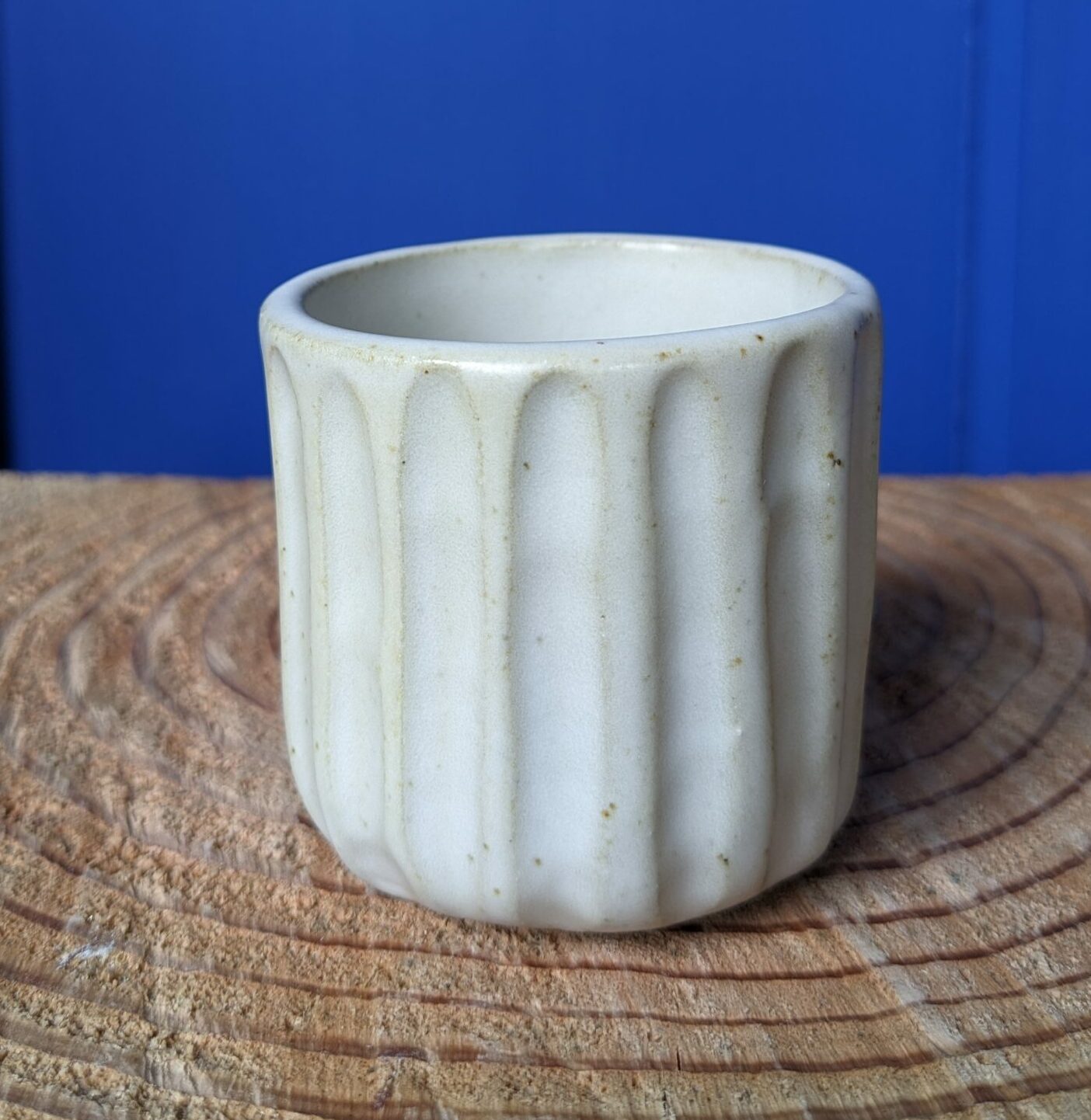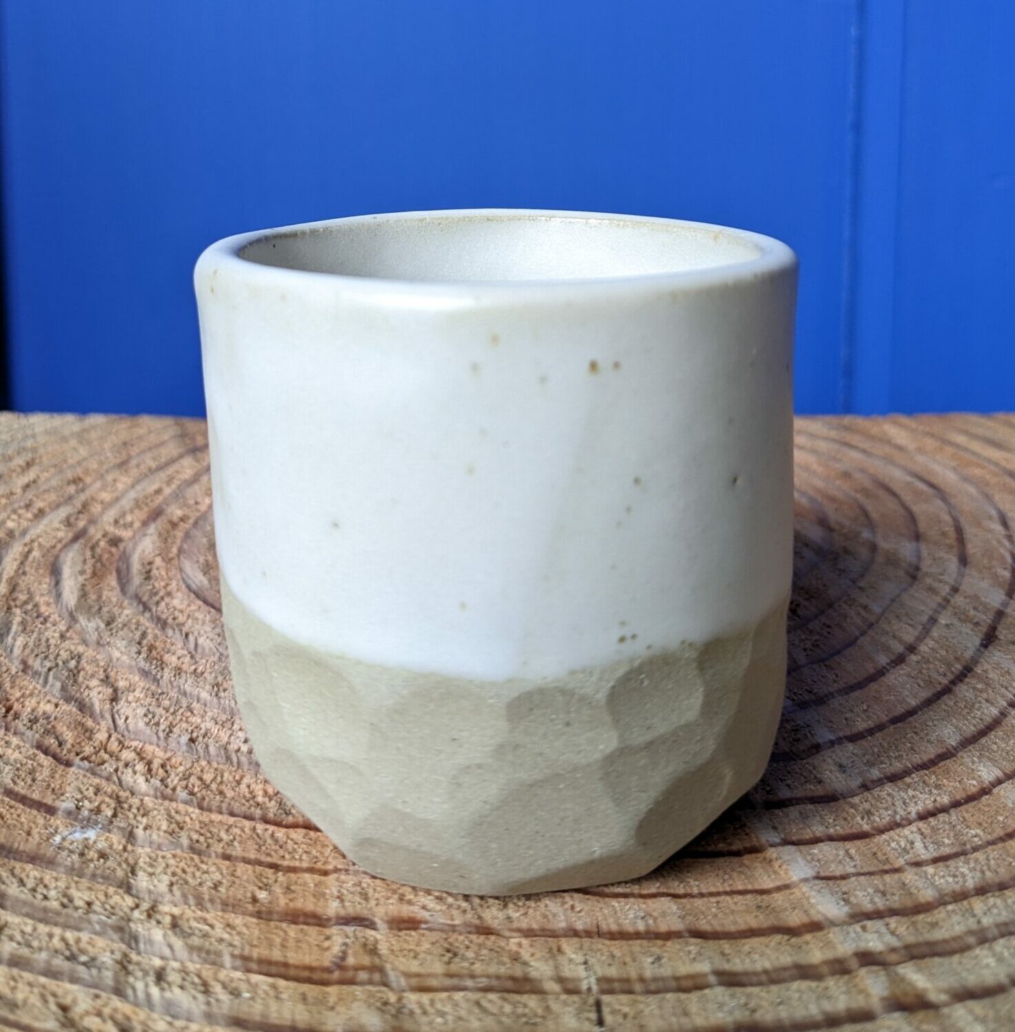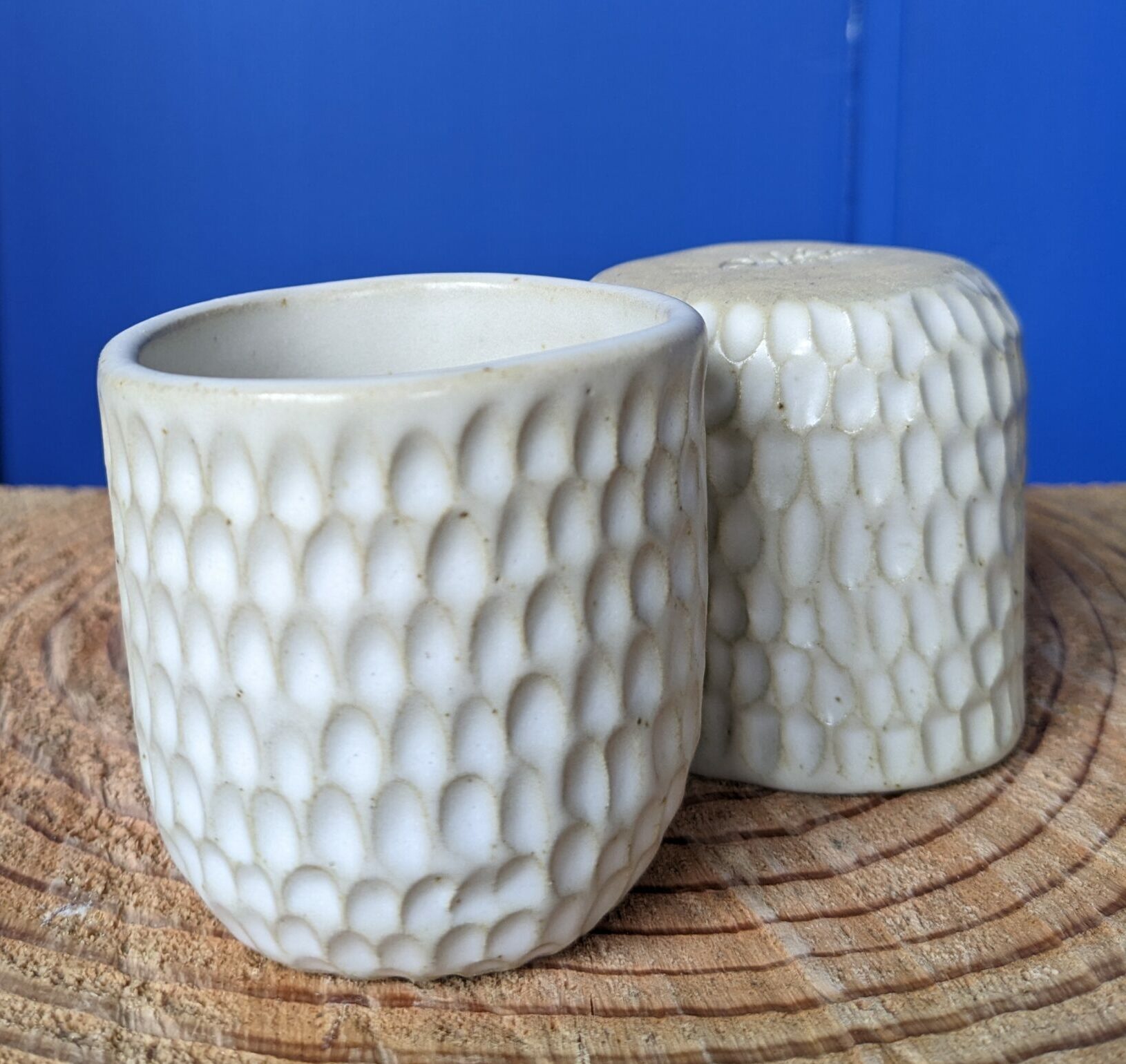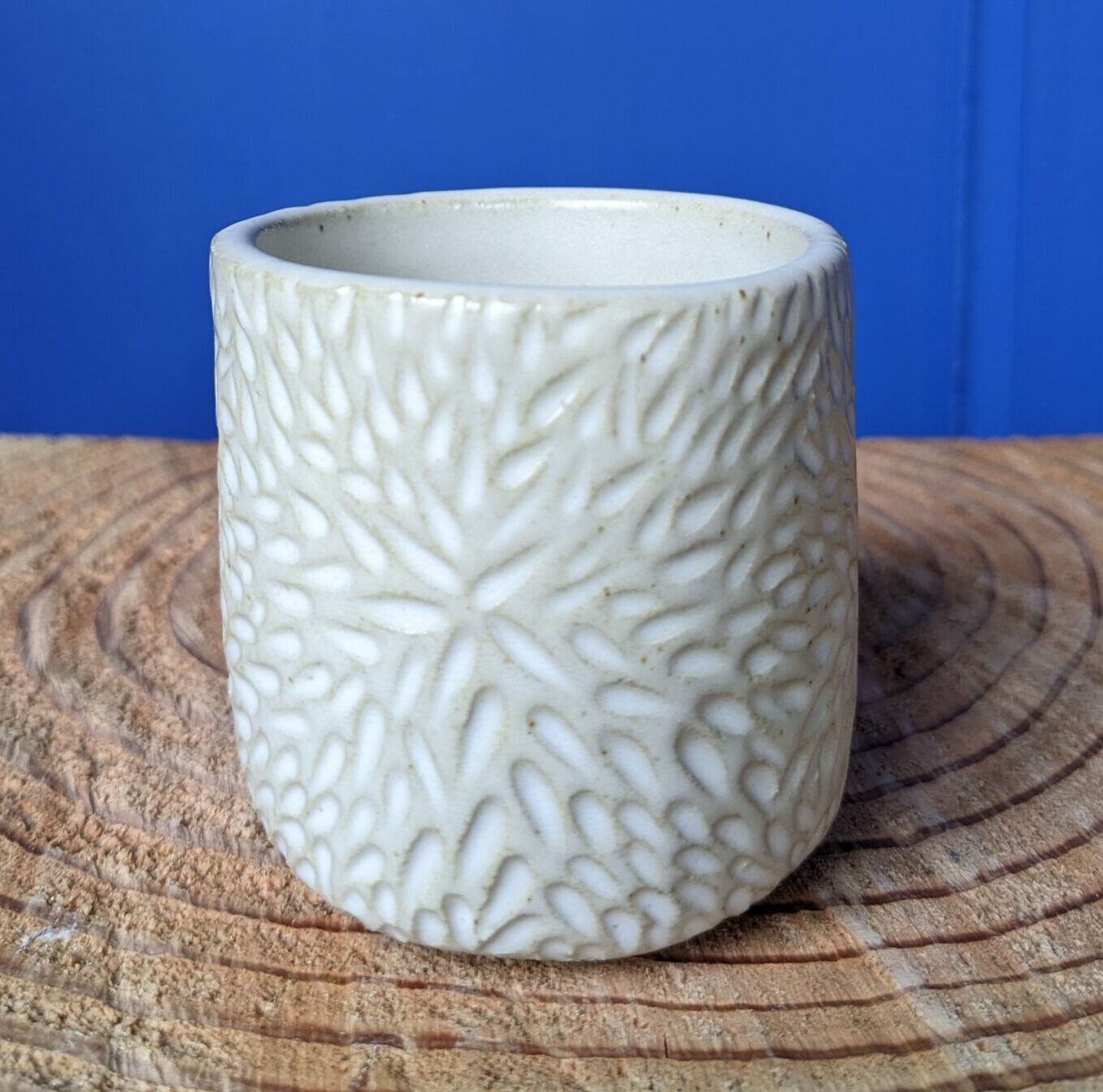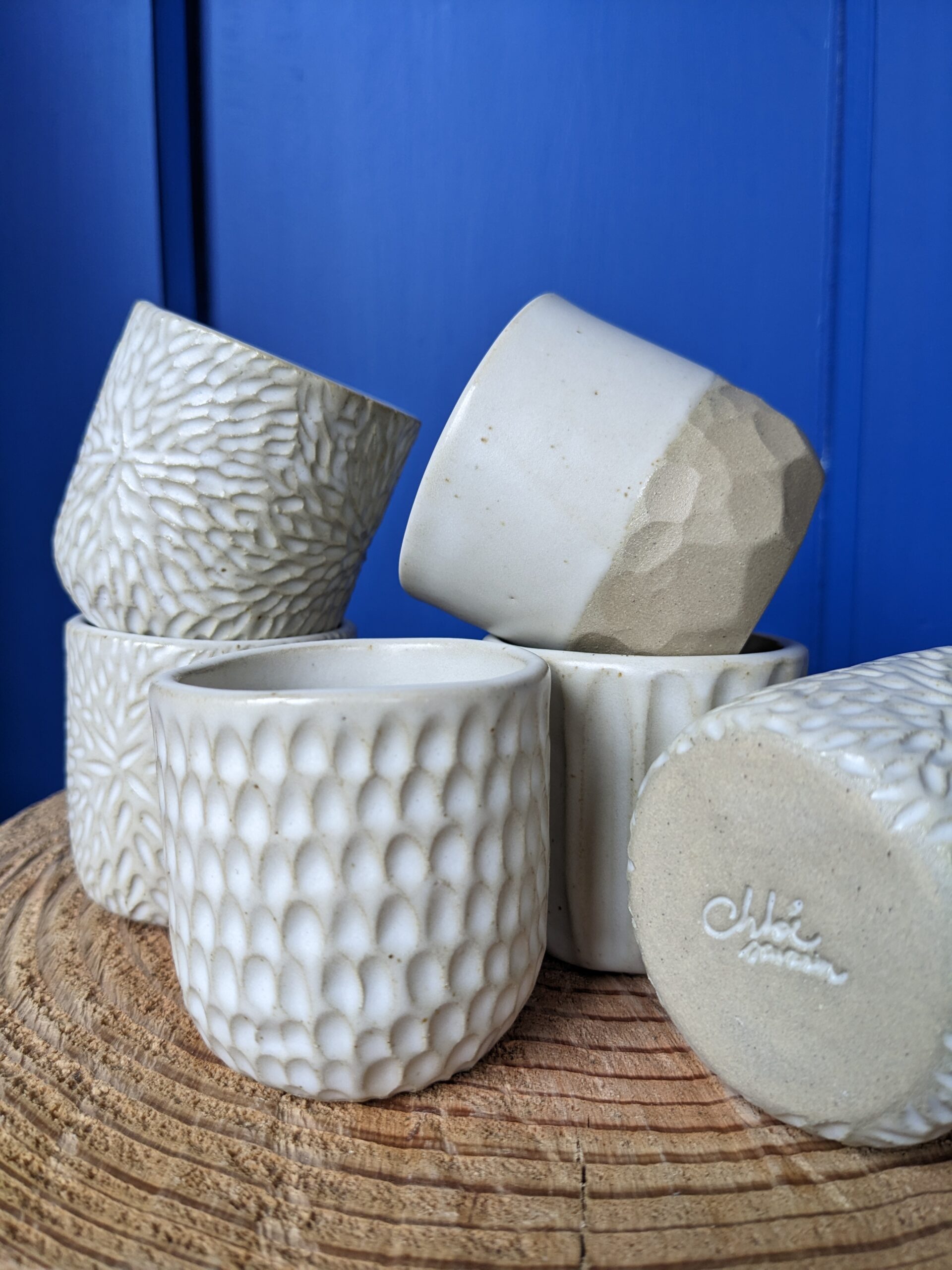 Modelée et décorée entièrement à la main dans mon atelier, cette tasse en grès offre un format idéal pour savourer votre café. Sa forme douce et sa finition texturée mettent en valeur un émail blanc mat, appliqué pièce par pièce, ce qui rend chaque exemplaire unique.